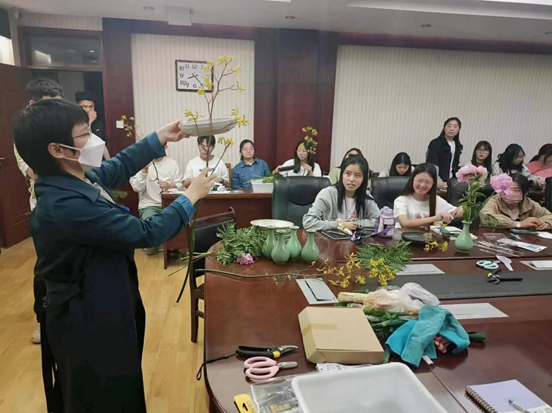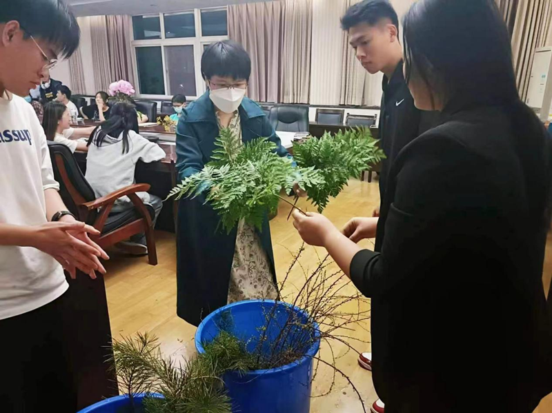 吴老师首先让大家区分了一下中国传统插花和西方插花的不同,由此引出今天的话题。然后吴老师详细介绍了中国传统插花的发展历程,让同学们感受到了插花文化的悠久历史,激起了同学们强烈的好奇心;接着,吴老师给同学们讲述了插花实践知识,插花过程中的细节,注意事项等等,使得同学们对插花技艺有了更深一步的了解;然后,在吴老师的指导下同学们以小组为单位进行插花实践。