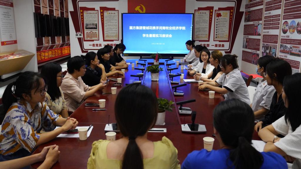 会议在圆方集团总部会议室举行,校企双方就实习生的工作表现、学习心得和成长收获进行了深入交流。圆方集团党委委员、圆方非公党建学院执行院长、人力资源部部长薛苗、雪绒花人力资源中心总监孙晓玲,集团各实习部门负责人参加了本次座谈会。