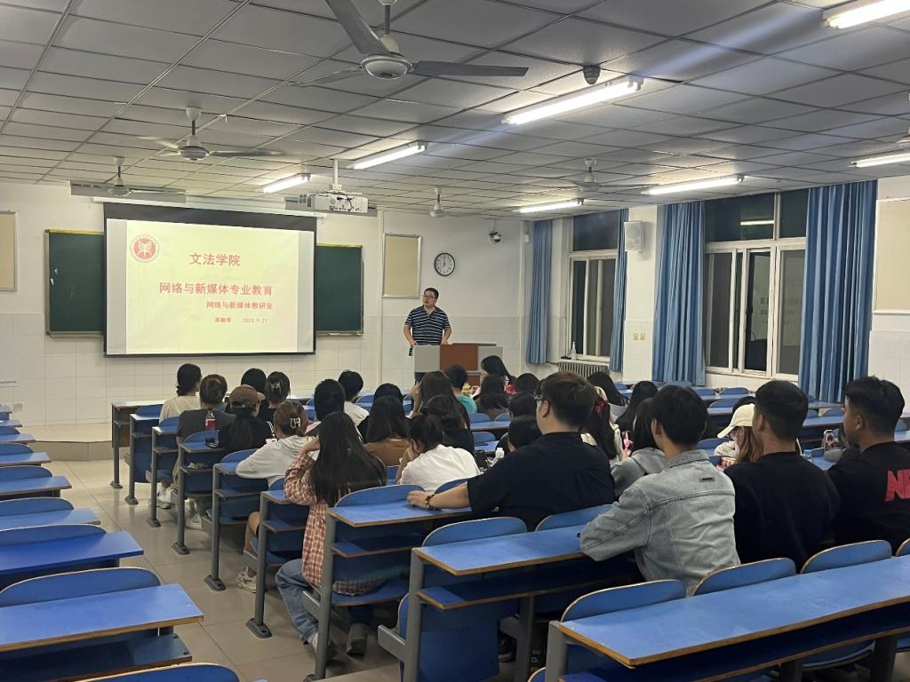 网络与新媒体教研室主任苏颜军老师首先为同学们介绍了网络与新媒体专业的办学历程、专业人才培养方案;在此基础上,又为同学们介绍了近年来专业办学的成果,包括学生考研考公等录取情况、参加学科竞赛获奖情况等,并通过播放往届优秀毕业设计代表作品,让同学们了解到经过大学阶段的学习,专业技能能够达到什么样的程度;最后,苏老师结合网络与新媒体专业正在大力推行的学科竞赛为新生们提出了多阅读专业书籍、培养独立思考能力、积极参加各类型的社会实践等建议。