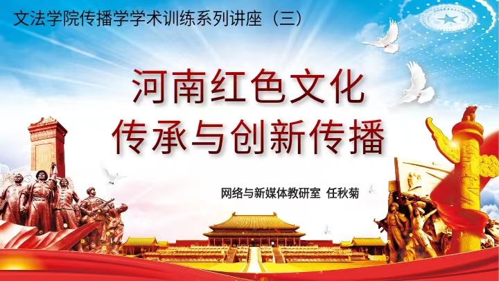 讲座伊始,王伟琴副院长介绍了任秋菊老师关于红色文化研究的基本情况。随后,任秋菊老师从红色文化的基本含义入手,梳理了“人”“物”“事”“魂”等几个方面的河南红色文化资源,介绍了红色文化的主要特征和重要作用。在此基础上,引导学生对河南红色文化的相关研究进行探讨,启发学生结合前两次的学术讲座,选择合适的切入点,对河南红色文化进行深入思考和研究。鉴于专业特点,任秋菊老师还鼓励学生要勇于创新,做优秀红色文化的传播者。
