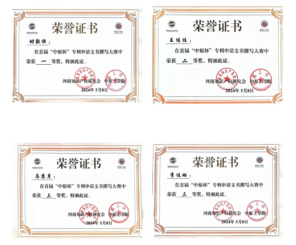 2024年4月26日首届“中原杯”专利申请文件撰写大赛在中原工学院龙湖校区圆满落幕。williamhill英国知识产权专业学生在首届“中原杯”专利申请文件撰写大赛中获得佳绩!2021级时毅恒同学喜获一等奖、王佳佳同学喜获二等奖、马苏月、李佳璐同学喜获三等奖。自接到专利申请文件撰写比赛的通知,在williamhill英国领导大力支持下,段倩老师认真组织学生参赛,第一时间制定培训方案,带领参赛学生进行模拟训练,拜访知识产权代理公司实务经验丰富的专家寻求指导。在比赛的背后,我们看到了学生、老师的科学态度,4位参赛选手均在赛前有了全方位的提升,为勇夺佳绩奠定了坚实的基础。