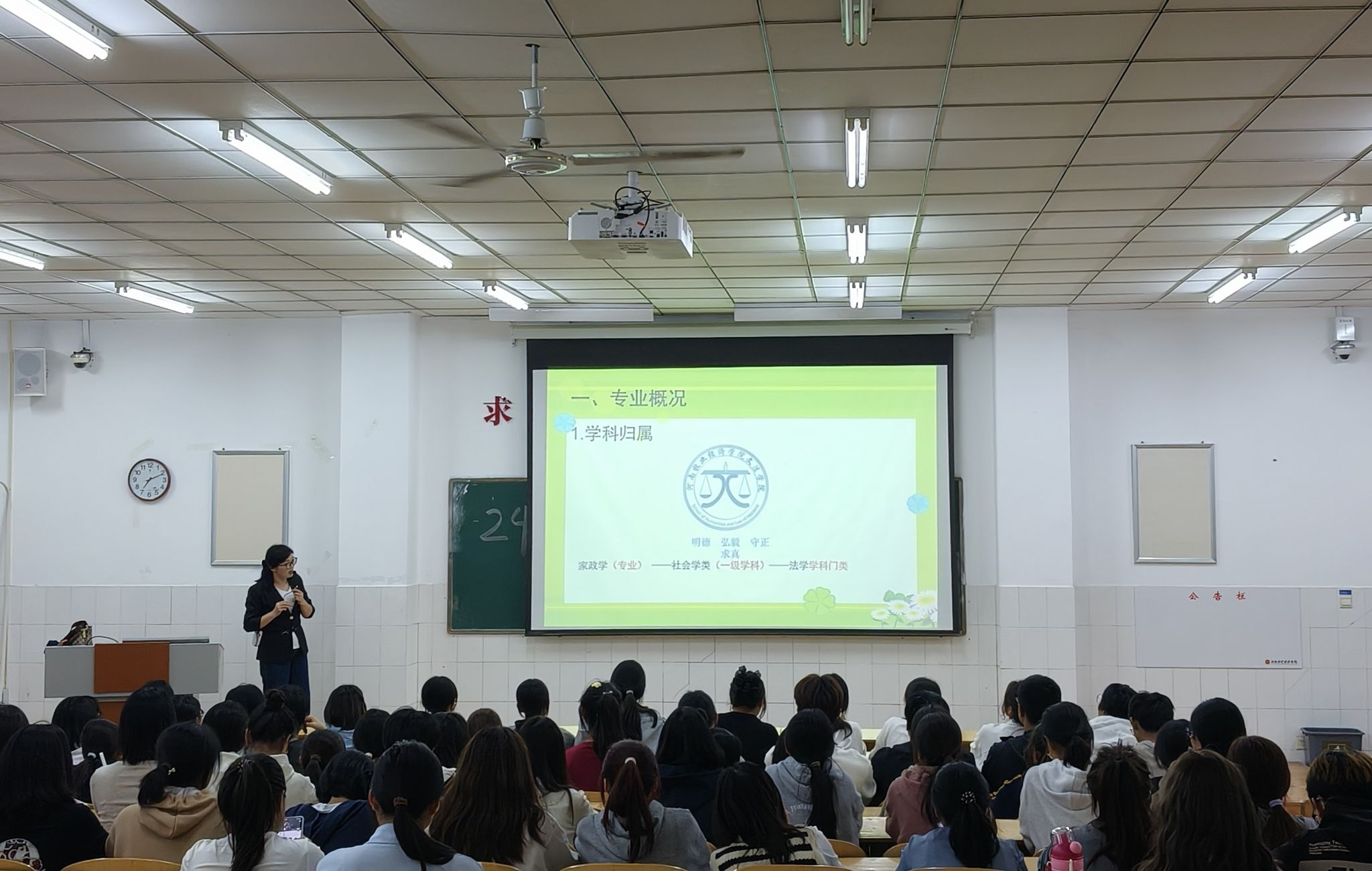 在E209教室,家政学教研室主任张会霞老师首先介绍了家政学专业的学科归属和发展历程,分享了家政学专业近年来的建设成果、产教融合成效以及毕业生考研就业情况。然后,她结合实际分析了当前社会对于家政专业高素质应用型人才的迫切需求。接着,张老师根据新修订的2024版人才培养方案详细解读了我校家政学专业的人才培养目标及课程体系设置。最后,张老师勉励大家不忘初心、砥砺前行,在大学四年深研家政之学、生活之艺,磨砺专业技能、锤炼综合素质,为未来的职业生涯打下坚实的基础。