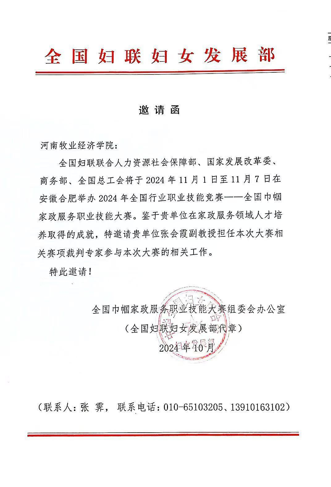 近日,由全国妇联、人力资源社会保障部、国家发展改革委、商务部、全国总工会共同主办的2024年全国巾帼家政服务职业技能大赛总决赛在安徽省合肥市隆重举行。我校家政学专业张会霞副教授受邀参加了总决赛部分项目的裁判工作。