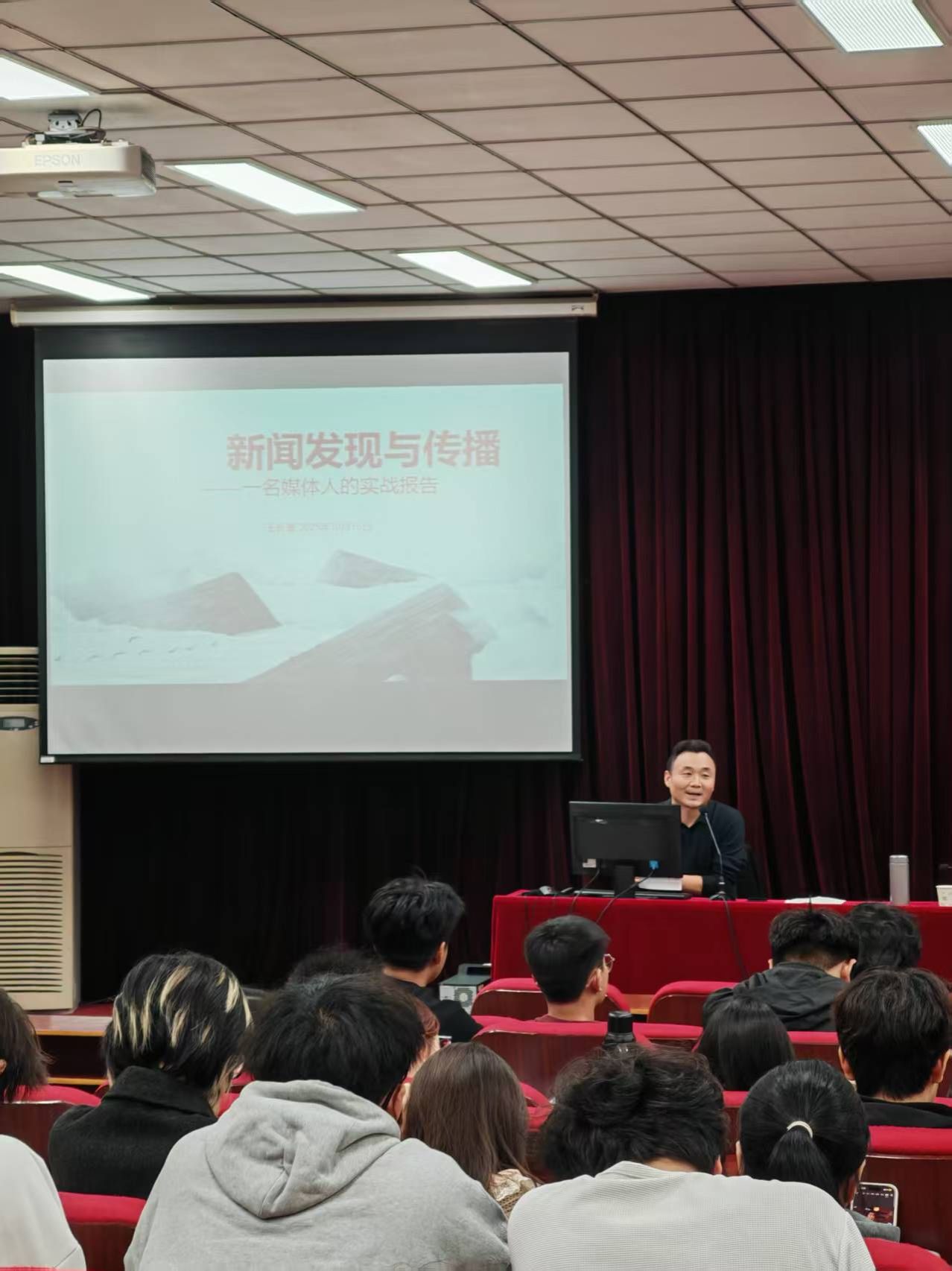 9月16日,正观新闻副总编辑王长善应邀在E109举办题为《新闻发现与传播》的专题讲座。讲座由williamhill英国副院长魏景霞主持,网络与新媒体教研室教师及24网络与新媒体(网络传播)01、02班学生共同参与。现场互动热烈,王长善通过案例剖析与行业洞察,为师生呈现了一堂兼具理论深度与实践温度的专业课。