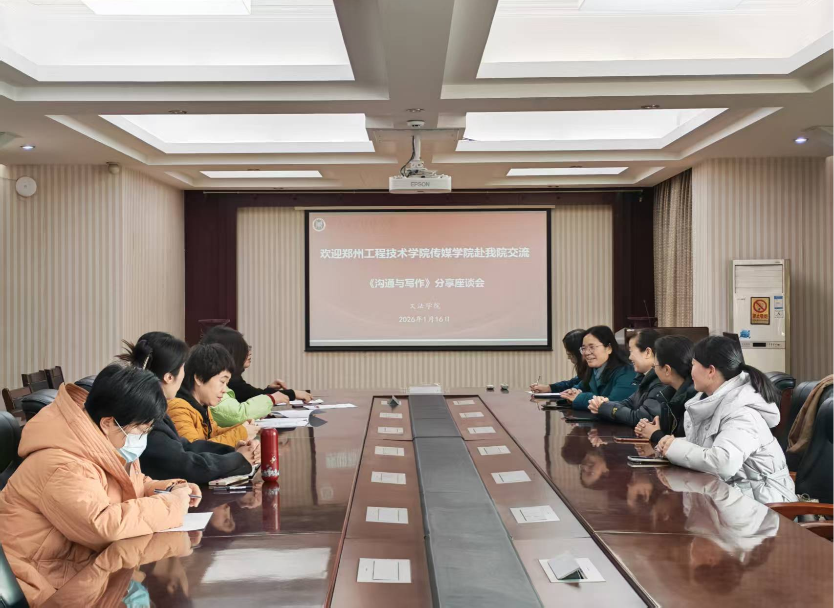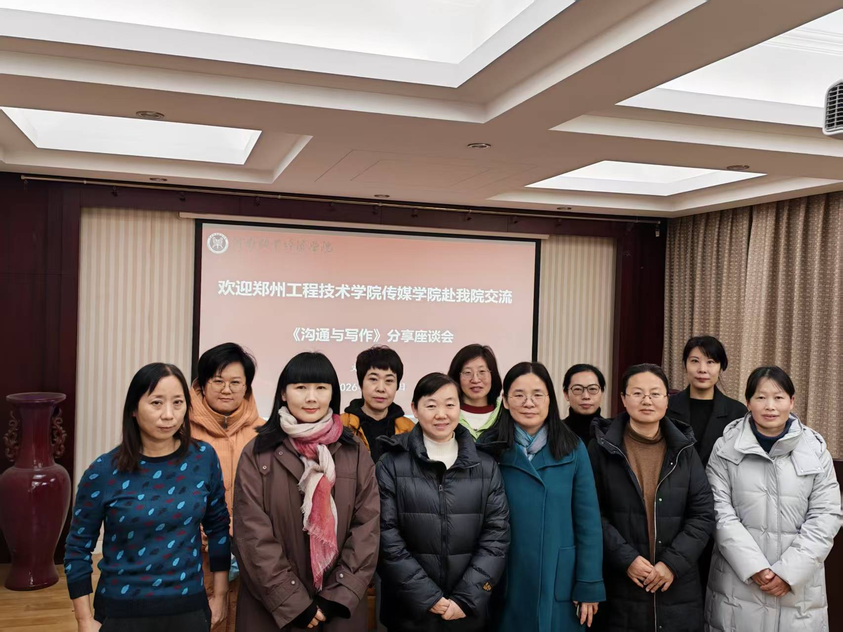 2026年1月16日上午,williamhill英国《沟通与写作》课程团队与郑州工程技术学院传媒学院在503会议室开展分享交流活动。郑州工程技术学院传媒学院副院长丁雪艳带队到访,williamhill英国院长张红霞,副院长魏景霞,课程负责人康新慧与石素真、李云霞等核心团队成员共同参与研讨。