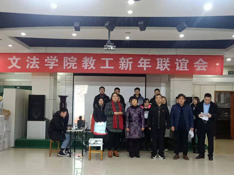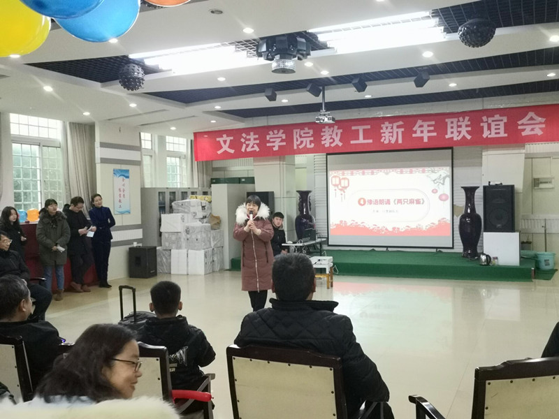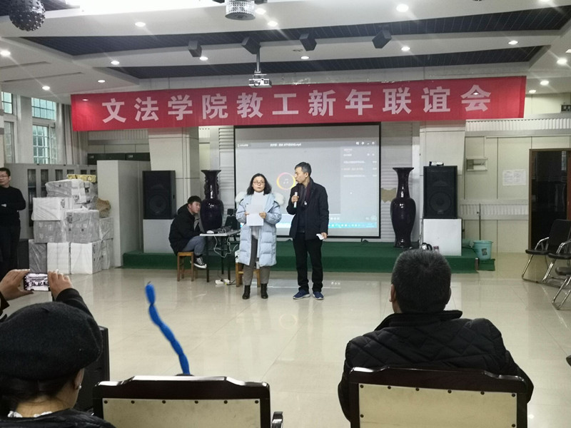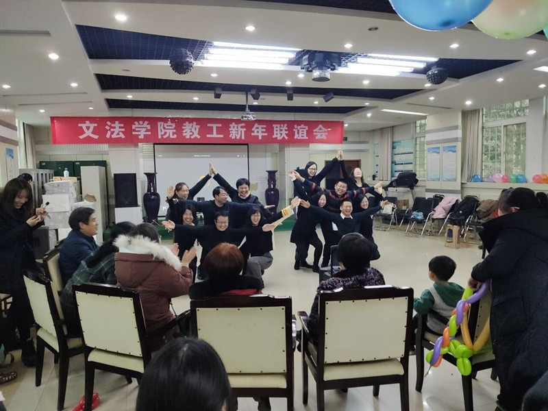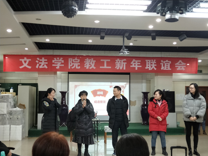 教工新年联欢会在院领导、行政学管老师带来的歌曲《好运来》中拉开帷幕,欢快的歌曲、动感的节奏,瞬间燃爆了现场。新闻传播教研室的歌曲串烧和赵志、孙琼阁老师的歌曲《朋友》声音动听,旋律优美,展示了不俗的演唱功力;白慧颖院长用河南话吟诵的《两只麻雀》诙谐幽默,不时引发阵阵笑声;大学语文教研室的诗朗诵《天耀中华》展示了她们的文学底蕴和文艺才情;法律和知识产权两个教研室表演的舞蹈《野狼DISCO》节奏明快,动感十足,将气氛推向了高潮!节目中间穿插的成语接龙、心有灵犀、珠联璧合等游戏体现了队友之间的默契配合,让大家更加深刻地体会到团队合作是多么重要。