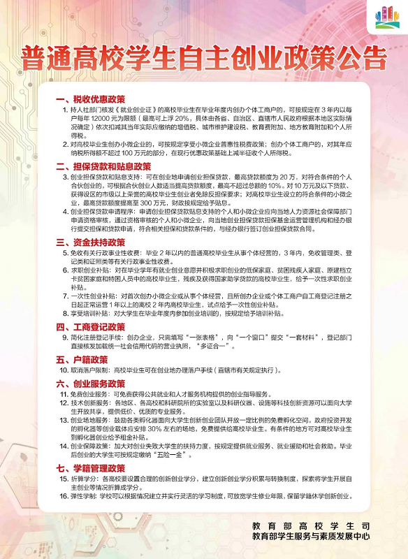 本期推送《普通高校学生自主创业政策公告》,内容包括税收优惠政策、担保贷款和贴息政策、资金扶持政策、工商登记政策、户籍政策、创业服务政策、学籍管理政策等。